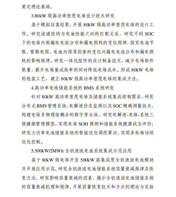 據(jù)2025年度山西省科技重大專項(xiàng)計(jì)劃“揭榜掛帥”項(xiàng)目(第一批)信息,全釩液流電池80kW級(jí)高功率密度電堆關(guān)鍵技術(shù)研究及示范應(yīng)用項(xiàng)目研究?jī)?nèi)容包括:1.高功率密度電堆模擬仿真技術(shù)研究;2.高效能電解液流道設(shè)計(jì)技術(shù)研發(fā);3.80kW級(jí)高功率密度電堆設(shè)計(jì)技術(shù)研究;4.高功率電堆儲(chǔ)能系統(tǒng)的BMS系統(tǒng)研發(fā);5.500kW/2MWh全釩液流電池系統(tǒng)集成示范應(yīng)用。