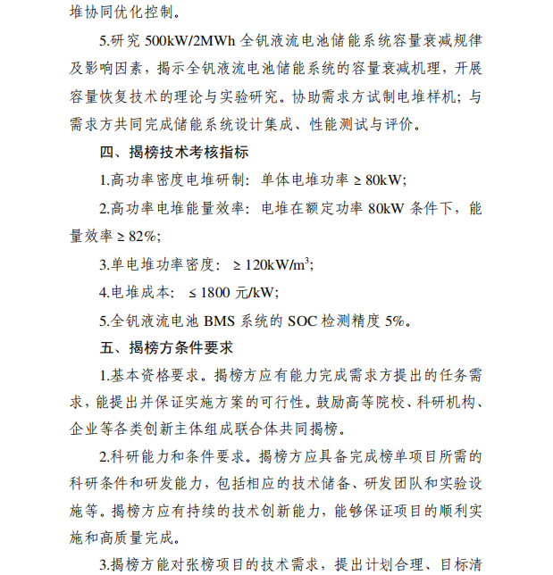 揭榜技術(shù)考核指標(biāo):1.高功率密度電堆研制:?jiǎn)误w電堆功率≥80kW;2.高功率電堆能量效率:電堆在額定功率80kW條件下,能量效率≥82%;3.單電堆功率密度:≥120kW/m3;4.電堆成本:≤1800元/kW;5.全釩液流電池BMS系統(tǒng)的SOC檢測(cè)精度5%。