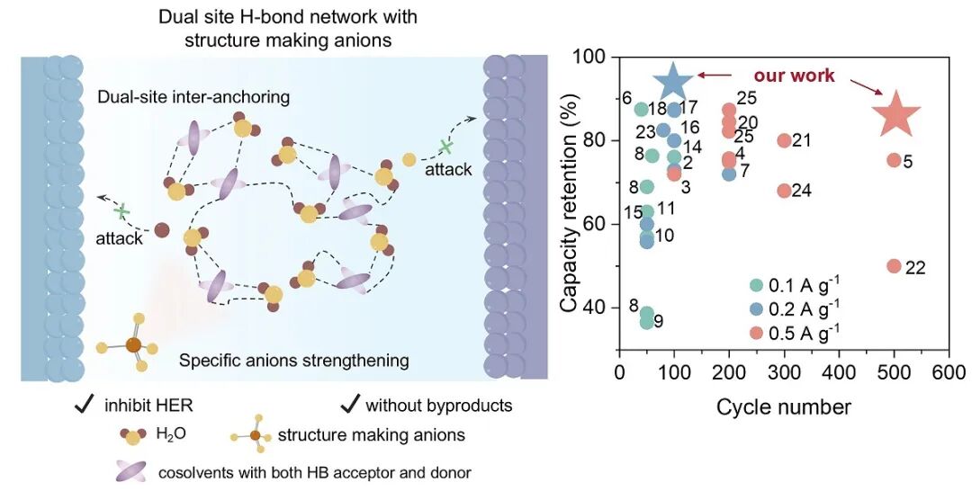 中國(guó)儲(chǔ)能網(wǎng)訊:近日,大連化物所無(wú)機(jī)膜與催化新材料研究組(504組)楊維慎研究員、朱凱月研究員團(tuán)隊(duì)在釩基水系鋅離子電池研究中取得新進(jìn)展。團(tuán)隊(duì)通過(guò)在電解液中構(gòu)建互鎖型強(qiáng)氫鍵網(wǎng)絡(luò),有效降低了水溶劑中氧和氫的反應(yīng)活性,從而抑制了正負(fù)電極的腐蝕。