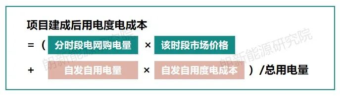 而項目建成后的用電度電成本,需綜合考量不同時段自電網(wǎng)購入的電量及其對應(yīng)市場價格,以及自發(fā)自用電量對應(yīng)的內(nèi)部發(fā)電成本,按用電比例加權(quán)平均得出。公式如下: