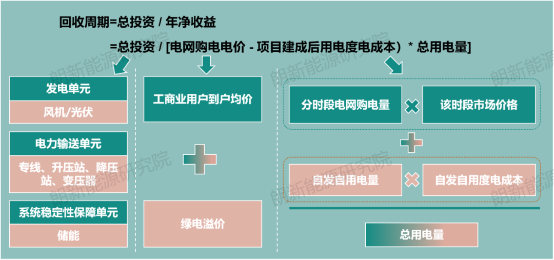 在評估綠電直連項目的投資價值時,投資回收周期是最直接、最關(guān)鍵的財務(wù)指標。假設(shè)項目在全生命周期結(jié)束后直接報廢,其計算方式可簡化為總投資金額除以每年凈收益,其中凈收益可理解為電網(wǎng)購電電價與項目建成后實際用電度電成本之差,再乘以總用電量。其中,電網(wǎng)購電電價為工商業(yè)用戶到戶均價與綠電溢價之和。