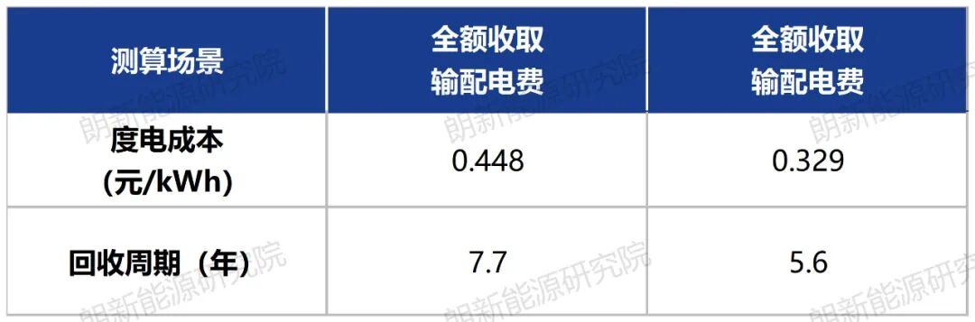 經(jīng)測算,發(fā)現(xiàn)風光互補模式具備最優(yōu)的經(jīng)濟優(yōu)勢。項目對應(yīng)兩種輸配電費收取方式測算度電成本分別為0.448元、0.329元,對應(yīng)回收周期分別為7.7年、5.6年,具備與配儲相接近的經(jīng)濟優(yōu)勢(表3)。