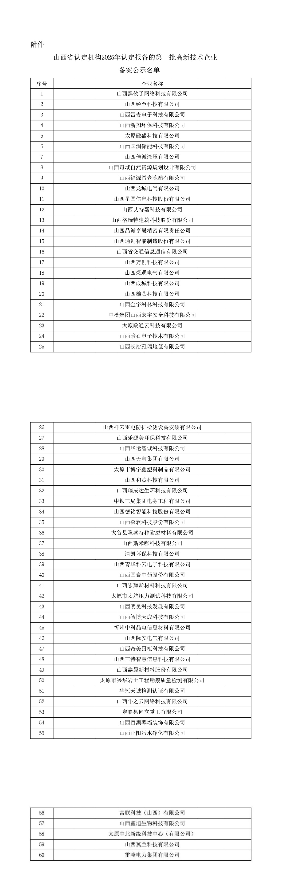 附件:山西省認(rèn)定機(jī)構(gòu)2025年認(rèn)定報(bào)備的第一批高新技術(shù)企業(yè)備案公示名單