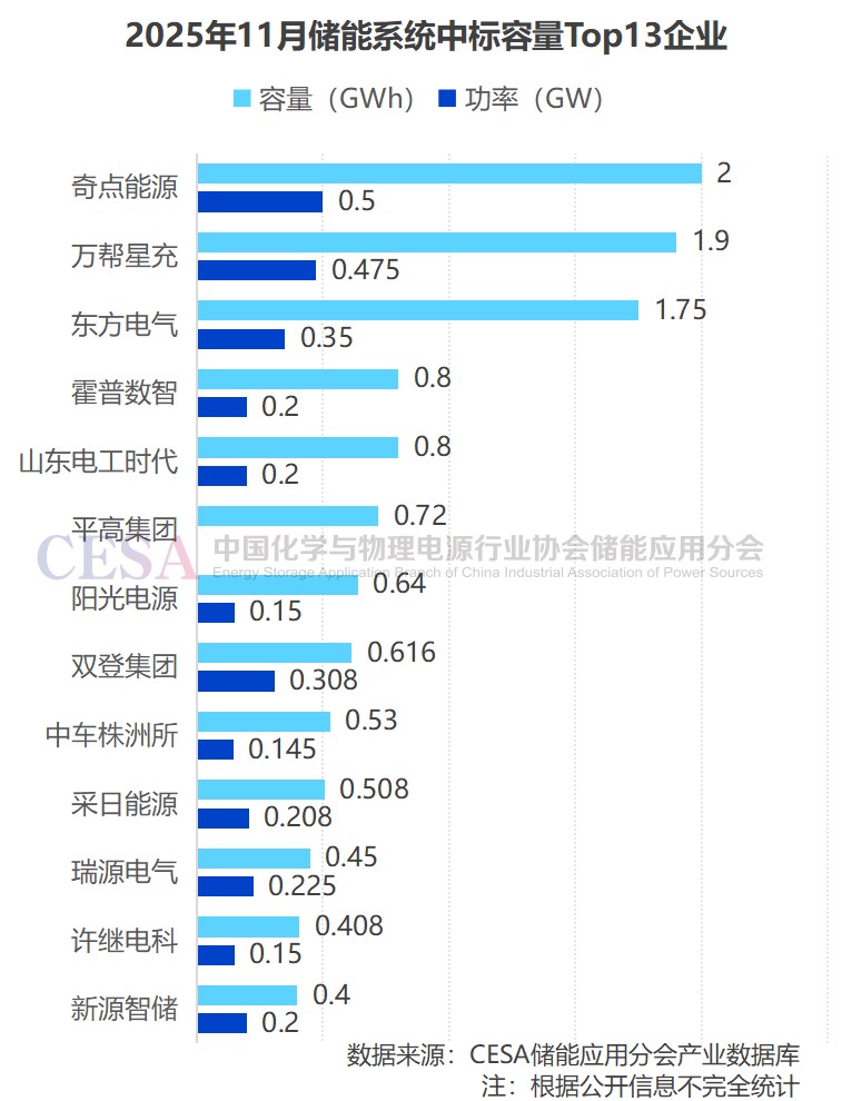 2025年11月,奇點能源儲能系統(tǒng)中標規(guī)模500MW/2GWh,位居全國榜首,萬幫星充、東方電氣儲能系統(tǒng)中標規(guī)模均超1GWh,分別排在第二、第三。Top 10 企業(yè)儲能系統(tǒng)中標規(guī)模均在500MWh以上。