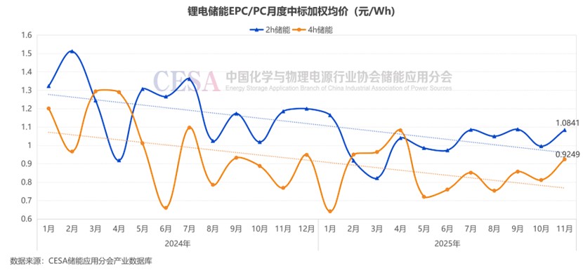 據(jù)CESA儲能應用分會產(chǎn)業(yè)數(shù)據(jù)庫不完全統(tǒng)計,2025年11月,國內(nèi)磷酸鐵鋰電池儲能EPC/PC(不含工商業(yè)儲能柜EPC/PC)報價主要集中在0.543-1.6906元/Wh區(qū)間內(nèi),平均報價1.018元/Wh,中標加權均價1.0154元/Wh,環(huán)比+13.4%。