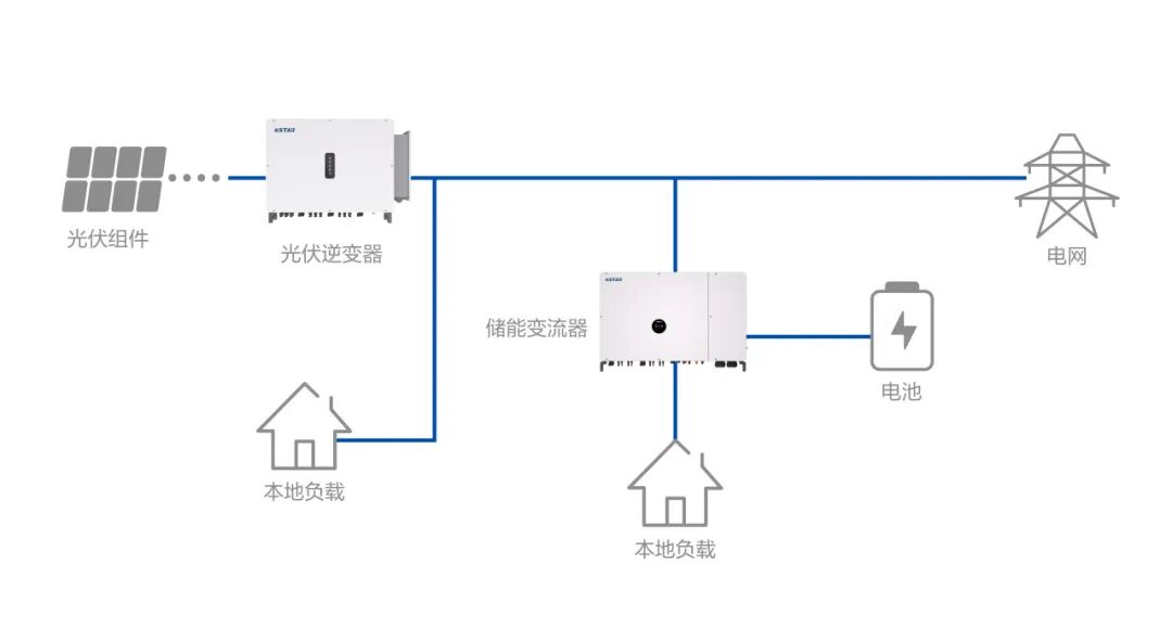 關(guān)鍵點:光伏給儲能電池充電時,電能必須經(jīng)歷“直流→交流→直流”的兩次轉(zhuǎn)換,系統(tǒng)靈活性高,交流功率可以適當(dāng)疊加增大,但存電時轉(zhuǎn)換損耗相對較大。