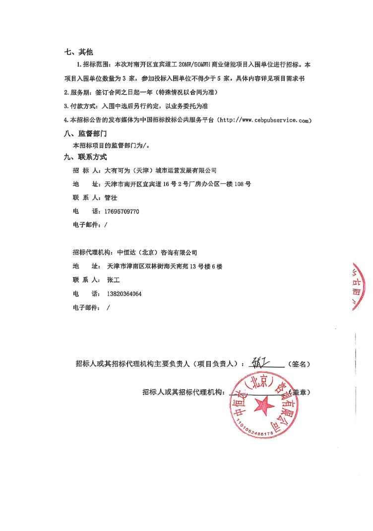 中國儲(chǔ)能網(wǎng)訊:12月9日,南開區(qū)宜賓道20MW/50MWH工商業(yè)儲(chǔ)能項(xiàng)目入圍單位招標(biāo)項(xiàng)目招標(biāo)公告發(fā)布。