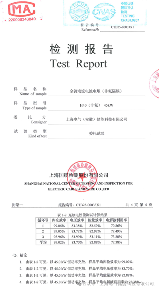 高性能非氟膜電堆是由上海電氣儲(chǔ)能科技有限公司聯(lián)合蘇州實(shí)驗(yàn)室、華東理工大學(xué)發(fā)布的儲(chǔ)能新品,并通過上海國纜檢測(cè)有限公司第三方產(chǎn)品測(cè)試,45kW額定功率下EE、CE和VE分別達(dá)到了82.8%、99.0%和83.7%。