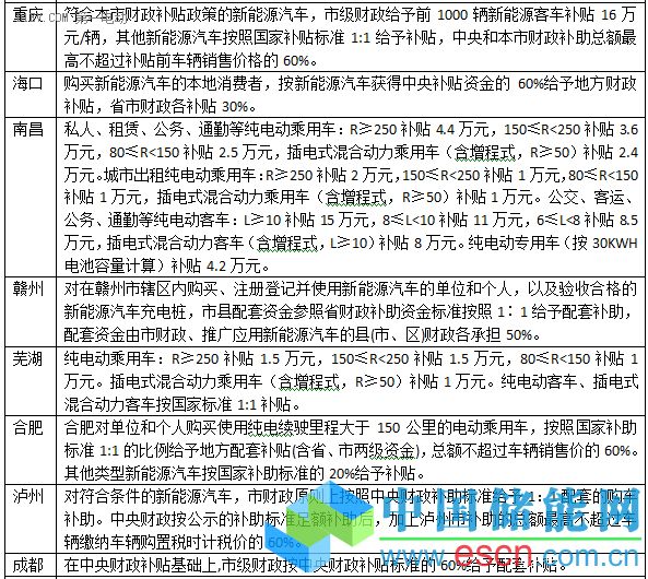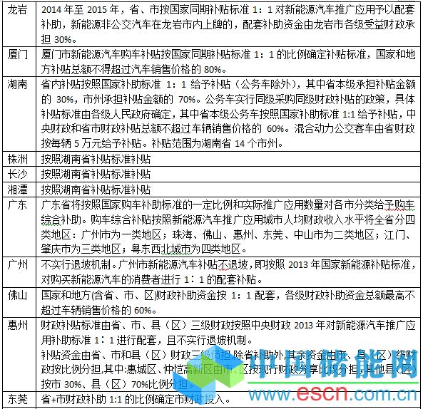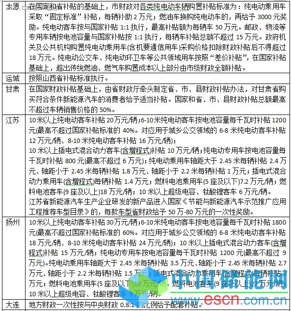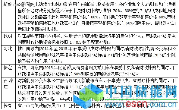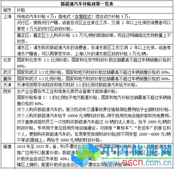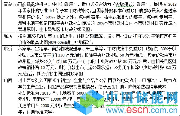 在46個省市的補貼政策里,按國家和地方財政1:1比例補貼的城市分別是:北京、青島、山東、濰坊、武漢、襄陽、天津、廣州、惠州、東莞西安、福建、龍巖、廈門、湖南、株洲、長沙、寧波、深圳、瀘州、贛州等,其中青島、廣州、惠州、深圳四城市實行不退坡機制。上海、太原、運城、廣東、大連、南昌、蕪湖、昆明等城市按各自不同的補貼方式給予補貼。