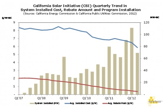 截止2012年第二季度末,加州太陽能計劃已經(jīng)補貼了980兆瓦的安裝量,很快將會達到1吉瓦的里程碑。在太平洋天然氣與電力公司 (PG&E,加州北部的私有電力公司) 的轄區(qū),住宅和非住宅項目的補貼水平都已經(jīng)下降到第10階段,也就是最后一個階段。在圣地亞哥天然氣與電力公司(SDG&E)轄區(qū)內(nèi)的住宅項目也是如此。最后一個階段提供US$0.20/W的初投資補貼或者為期5年的US$0.025/kWh的上網(wǎng)電價。