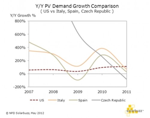 圖一:美國光伏需求增長率與意大利、西班牙和捷克對比