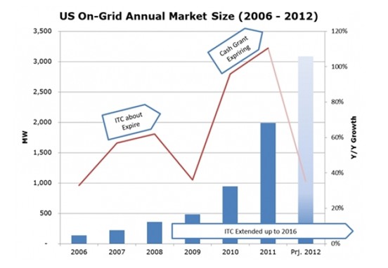 類似地,聯(lián)邦現(xiàn)金補助法案的到期在2011年底導致一波安裝量的激增,以便能取得補貼的合法資格。目前預期在2012年市場的增速會再次放緩。