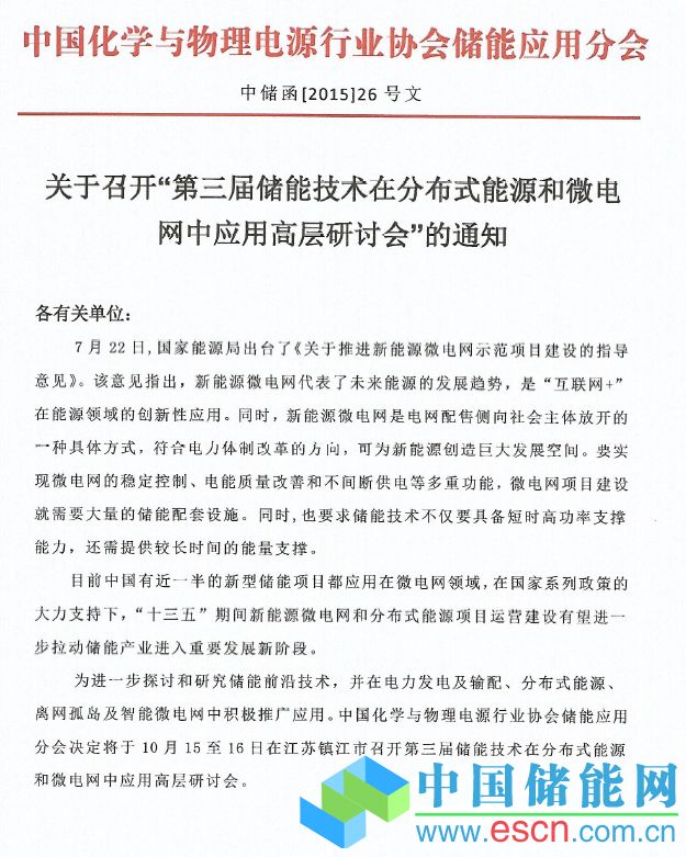 為進(jìn)一步探討和研究前沿儲(chǔ)能技術(shù),并在電力發(fā)電及輸配、分布式能源、離網(wǎng)孤島應(yīng)用及智能微電網(wǎng)中積極推廣和利用儲(chǔ)能技術(shù)。中國(guó)化學(xué)與物理電源行業(yè)協(xié)會(huì)儲(chǔ)能應(yīng)用分會(huì)與中國(guó)儲(chǔ)能網(wǎng)將于10月15至16日在江蘇鎮(zhèn)江明都大飯店召開(kāi)第三屆儲(chǔ)能技術(shù)在微電網(wǎng)及分布式能源中的應(yīng)用高層研討會(huì)。