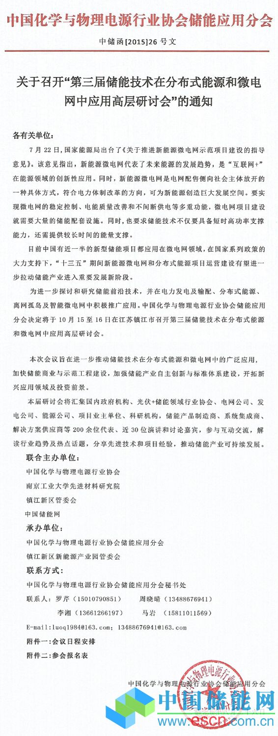中國(guó)儲(chǔ)能網(wǎng)訊:為進(jìn)一步探討和研究?jī)?chǔ)能前沿技術(shù),并在電力發(fā)電及輸配、分布式能源、離網(wǎng)孤島及智能微電網(wǎng)中積極推廣應(yīng)用。中國(guó)化學(xué)與物理電源行業(yè)協(xié)會(huì)儲(chǔ)能應(yīng)用分會(huì)決定將于10月15至16日在江蘇鎮(zhèn)江市召開第三屆儲(chǔ)能技術(shù)在分布式能源和微電網(wǎng)中應(yīng)用高層研討會(huì)。