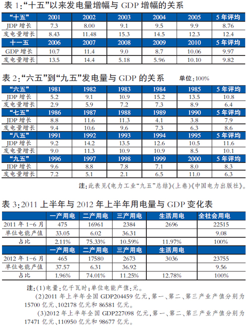 社會(huì)方方面面之所以有這種質(zhì)疑,緣于沒(méi)有全面了解我國(guó)改革開(kāi)放以來(lái)用電量與GDP的關(guān)系。這些讀者都認(rèn)為,我國(guó)用電量增幅高于GDP增幅理所當(dāng)然,一旦某一年份用電量增幅低于GDP增幅就認(rèn)為不正常。這是為什么呢?這是因?yàn)樽?000年到2011年的11間,其中9個(gè)年頭我國(guó)用電量增幅是高于GDP增幅的,而且11年內(nèi)用電量年平均增幅也是高于GDP的(見(jiàn)表1)。殊不知,我國(guó)自改革開(kāi)放以來(lái),有很多年份用電量增幅是低于GDP增幅的。如1978年至2000年21年間,我國(guó)用電量大部分年份增幅是低于GDP的,而且年均用電量增幅也是低于GDP增幅的。比如“六五”時(shí)期GDP平均增幅為10.8%,而用電量平均增幅為6.4%;“七五”時(shí)期GDP增幅為8.6%,用電量增幅為9.1%;“八五”時(shí)期增幅為11.6%,用電量增幅為10.1%;“九五”時(shí)期GDP增幅為8.3%,用電量增幅為6.3%。從“六五”到“九五”的20年時(shí)間內(nèi),只有“七五”的用電量增幅高于同期的GDP增幅,其余15年都是用電量增幅低與GDP增幅的,而且這20年用電量平均增幅也是低于GDP增幅的(見(jiàn)表2)。