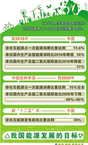 四、大力發(fā)展新能源和可再生能源。到2015年,非化石能源消費(fèi)占一次能源消費(fèi)比重將達(dá)到11.4%,非化石能源發(fā)電裝機(jī)比重達(dá)到30%。其中,2015年,水電裝機(jī)容量2.9億千瓦;運(yùn)行核電裝機(jī)容量4000萬(wàn)千瓦;風(fēng)電裝機(jī)突破1億千瓦,其中海上風(fēng)電裝機(jī)500萬(wàn)千瓦;太陽(yáng)能發(fā)電裝機(jī)容量2100萬(wàn)千瓦以上,太陽(yáng)能集熱面積達(dá)到4億平方米;建成1000個(gè)左右天然氣分布式能源項(xiàng)目,以及10個(gè)左右各類典型特征的分布式能源示范區(qū)域。