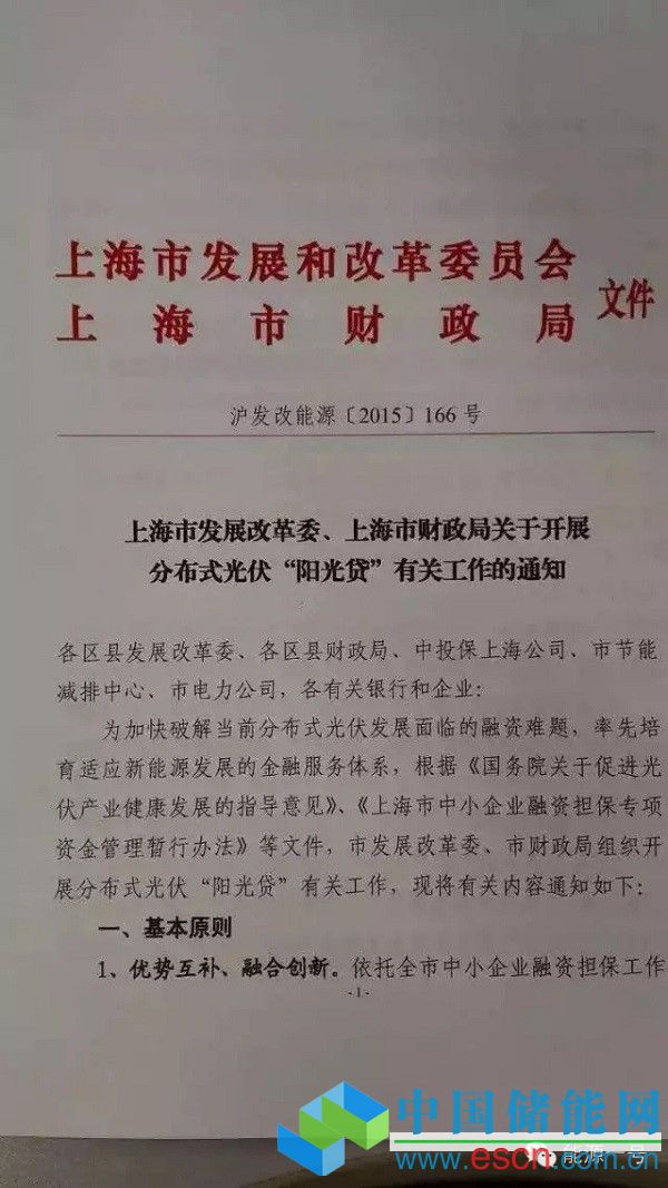 12月16日下午,“能源一號”從權(quán)威部門獲得確認,上海市發(fā)改委聯(lián)合上海市財政局已發(fā)布了一則文件,通過“陽光貸”這一新政力促解決分布式光伏的貸款問題。