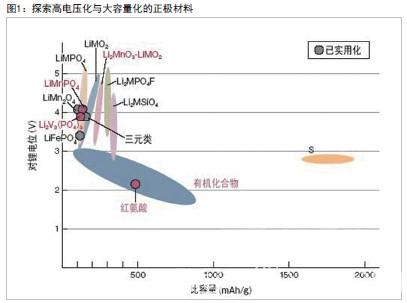 現(xiàn)有鋰離子充電電池的正極材料使用的是鈷酸鋰( L i C o O 2) 、三元類( L i N i M n C o O 2 ) 、錳酸鋰( L i M n 2 O 4 ) 、磷酸鐵鋰(LiFePO4)等。但這些正極材料的理論容量都在200mAh/g以下。因此必須尋找超過200mAh/g的新材料,或是使用能夠?qū)⒛壳爸挥?V左右的對鋰電位提高到5V左右的5V類正極材料,增加能量密度*(圖1)。