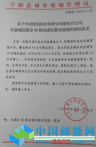 中國(guó)儲(chǔ)能網(wǎng)訊:2月29日,寧陽(yáng)縣城鄉(xiāng)規(guī)劃管理局下發(fā)《關(guān)于中國(guó)鐵塔股份有限公司泰安市分公司在縣城區(qū)建設(shè)4G移動(dòng)通信基站設(shè)施的規(guī)劃意見(jiàn)》,批復(fù)同意20處縣城區(qū)通信基站選址建設(shè),要求加快施工進(jìn)度,確保施工安全,協(xié)調(diào)好施工中的各方關(guān)系,盡快完成建設(shè)任務(wù),進(jìn)一步提升通信基站設(shè)施整體水平,完善移動(dòng)4G信號(hào)覆蓋。
