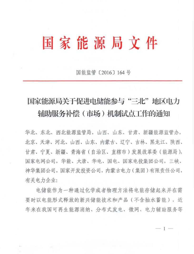 中國(guó)儲(chǔ)能網(wǎng)訊:2016年6月7日,能源局下發(fā)了《國(guó)家能源局關(guān)于促進(jìn)電儲(chǔ)能參與“三北”地區(qū)電力輔助服務(wù)補(bǔ)償(市場(chǎng))機(jī)制試點(diǎn)工作的通知》,以下為全文內(nèi)容:
