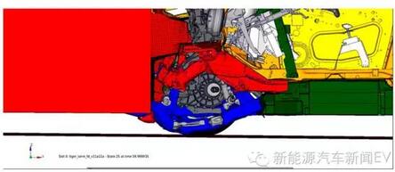 從圖片上可以看出,正面碰撞時(shí)車(chē)架接凹進(jìn)去了,而電池包模組部分(綠色部分)沒(méi)有任何的變形。