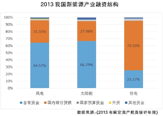首先,融資方式較少。從融資渠道來看,新能源項(xiàng)目資金主要來源于企業(yè)自有資金和國內(nèi)貸款。2013年,自有資金和國內(nèi)貸款在風(fēng)電、太陽能、核電項(xiàng)目融資結(jié)構(gòu)中的比例分別達(dá)到96.11%、94.77%和95.57%。由于新能源企業(yè)上市門檻較高以及我國債券市場發(fā)展相對滯后,直接融資僅占資金來源的10%左右。而多數(shù)風(fēng)險(xiǎn)投資機(jī)構(gòu)對新能源項(xiàng)目的投資尚處于探索階段,投資規(guī)模較小。從融資工具來看,國內(nèi)金融結(jié)構(gòu)匹配新能源產(chǎn)業(yè)的融資產(chǎn)品體系較不完善,新型抵押擔(dān)保、信托、可轉(zhuǎn)債、互聯(lián)網(wǎng)融資等創(chuàng)新融資工具應(yīng)用較少。