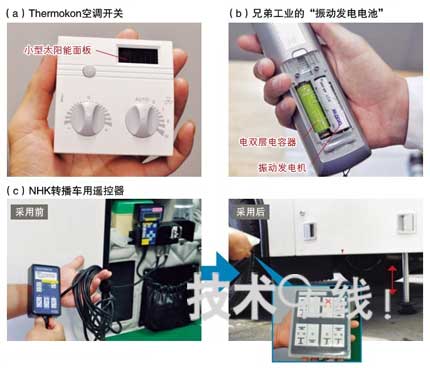 | 圖2 因無電池便利性提高 要點為:不需要一次性電池的更換與配線(a) 。組合電容與發(fā)電機的“振動發(fā)電電池”(b) 。與干電池的尺寸與形狀相同,可以直接在遙控器上使用。NHK富山電視臺與湯淺工機共同開發(fā)了轉播車千斤頂遙控器試制品(c) ,用手指按鈕的力量來發(fā)電。 |