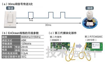 | 圖4 主攻低功耗及易用性的EnOcean 30ms間信號只傳送3次的簡單方式(a) 。 待機電流低到只有0.2μA(b) 。所使用的頻帶會依國家與地區(qū)而變。因模塊化易用性提高(c) 。 |