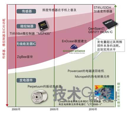 | 圖3 發(fā)電量超過本身的消耗 在發(fā)電器件性能提高的同時,其周邊部件的耗電量正穩(wěn)步下降。尤其在在耗電量最大的無線收發(fā)IC領域,擁有很高技術實力的風險企業(yè)的面世具有重要意義。 |