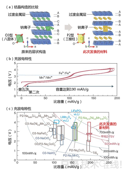 實際上,東京理科大學(xué)發(fā)布的鐵類層狀正極材料Na2/3(Fe1/2Mn1/2)O2的比容量為190mAh/g注1)。特點是,顯示出了鈉和氧形成三棱柱網(wǎng)格的P2型層狀構(gòu)造。