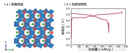 僅以鐵構(gòu)成的NaFeO2一般采用鈉和氧形成八面體網(wǎng)格的O3型積層構(gòu)造,以3.5V以上電壓充電時,隨著鐵離子的移動會發(fā)生不可逆相變。而P2型Na2/3(Fe1/2Mn1/2)O2即使充電電壓超過3.5V,也可以根據(jù)鐵的氧化還原反應(yīng)獲得可逆容量,充電電壓提高至4.5V時仍能維持層狀構(gòu)造。