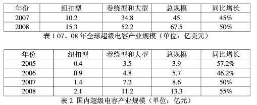 表1、表2是對三種超級電容器產(chǎn)業(yè)規(guī)模進行調(diào)查而得到的數(shù)據(jù)整理而成的,分別反映了世界和中國超級電容器產(chǎn)業(yè)的情況。從這兩個表中我們不難發(fā)現(xiàn)三個問題: