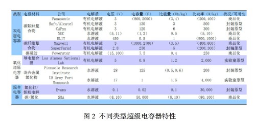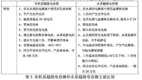 表3列出了有機系超級電容器和水系超級電容器的一些特性上的主要區(qū)別。
