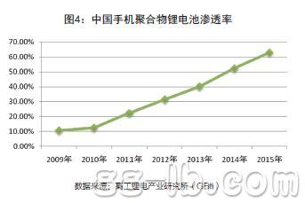 據(jù)高工鋰電產(chǎn)業(yè)研究所(G B I I)統(tǒng)計(jì),2 0 0 9年,聚合物鋰離子電池在手機(jī)電池中的應(yīng)用比例為10.7%,而到2012年,聚合物鋰離子電池的應(yīng)用比例已經(jīng)達(dá)到了32.5%。預(yù)計(jì)在未來(lái)的幾年中,隨著國(guó)內(nèi)3G市場(chǎng)的逐步成熟,以及智能手機(jī)滲透率的快速上升,聚合物鋰離子電池將是未來(lái)手機(jī)電池中的主流,而相應(yīng)的也將帶動(dòng)其市場(chǎng)滲透率的快速上升。到2015年,聚合物鋰離子電池在手機(jī)中的應(yīng)用比例將達(dá)到63.5%。(圖4)