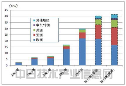 圖1:全球太陽能電池板出貨量走勢。預計2013年歐洲將大幅減少,但亞洲和美洲會增加。本圖是2012年5月發(fā)表的數(shù)據(jù),因此2012年也為預測值。是根據(jù)政策促進情況分析出的需求增加(出處:歐洲光伏發(fā)電協(xié)會(EPIA))