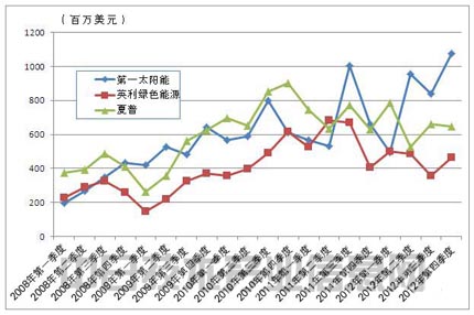 雖然太陽能電池板在全球都存在旺盛的需求,但并不代表太陽能電池板廠商一定會獲得良好業(yè)績,例如,2013年3月中國大型廠商無錫尚德太陽能電力宣布破產(chǎn)。從美國、中國和日本的代表性廠商的太陽能電池板銷售額走勢來看,在2010年底之前,三家公司的銷售額基本是以相同的趨勢增長(圖3)。