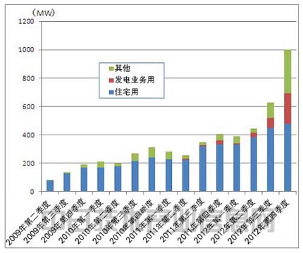 取代歐洲實現(xiàn)增長的是亞洲和美洲。在亞洲,中國、日本和印度三大市場將實現(xiàn)增長。日本從2012年7月開始實行可再生能源固定價格收購制度,太陽能電池板的設置數(shù)量隨之猛增。日本的太陽能電池板出貨量在2012年第四季度首次達到了1GW(圖2)。其中,住宅用途約占一半,包括百萬瓦級光伏電站在內(nèi)的發(fā)電業(yè)務用途占2成多。