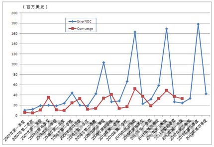 美國EnerNOC銷售額走勢的特點是,在最需要進行供求調整的第三季度銷售額明顯增加。該公司的銷售額走勢波動較大,但整體呈增加趨勢。美國Comverge因2012年3月發(fā)布了收購消息,銷售額數(shù)據(jù)只到2012年第一季度,但到此時為止一直穩(wěn)步增長。
