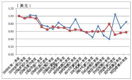 圖4:太陽能電池板每GW的銷售額指數(shù)走勢,根據(jù)First Solar和夏普各季度的出貨量和銷售額計算得出。以2008年第一季度的值為1進行了指數(shù)換算。藍色為First Solar,紅色為夏普。