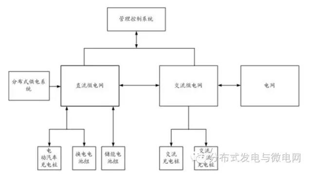 直流微電網(wǎng)包括直流母線,以及分別通過(guò)各自的變流器連接直流母線的分布式直流供電裝置、直流儲(chǔ)能裝置、直流充電樁和換電電池直流充放電裝置。