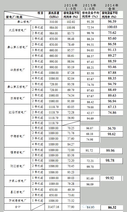 中電聯(lián)最新發(fā)布的《2016年前三季度全國電力供需形勢分析預測報告》也指出,核電方面,與上年同期相比,除廣東外的其余省份設備利用小時降幅均超過250小時,其中,福建、遼寧分別降低645、780小時。