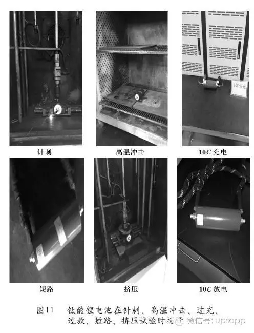 使用安全。鈦酸鋰電池在短路、過充、過放、擠壓、針刺、跌落、高溫沖擊、加熱的條件下是非常安全的,圖11是鈦酸鋰電池在針刺、高溫沖擊、過充、過放、短路、擠壓試驗時的場景;