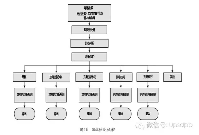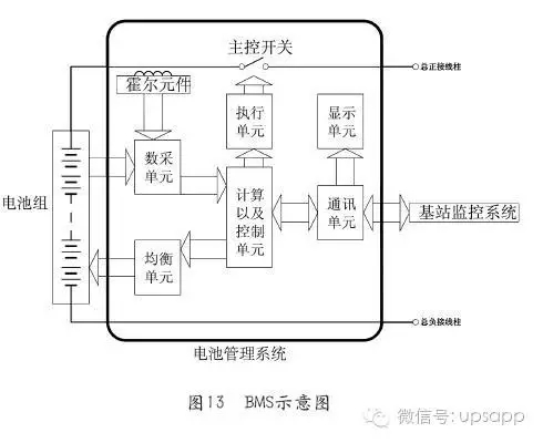 電池管理系統(tǒng)(Battery Management System,BMS)由監(jiān)測、保護電路、電氣、通訊接口、熱管理和電池組反接保護裝置等組成,是電池保護和管理的核心組成部分,不僅要保證電池安全可靠的使用,而且要充分發(fā)揮電池的性能和延長使用壽命,作為通信用的后備能源,BMS在開關(guān)電源和電池之間起到一個重要橋梁作用。對BMS的要求必須符合通信電源供電系統(tǒng)的要求,所以BMS的安全管理模式對電池的安全性至關(guān)重要。BMS主要包括數(shù)據(jù)采集單元、計算以及控制單元、均衡單元、控制執(zhí)行單元和通訊單元等。圖13為BMS示意圖。