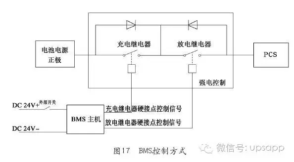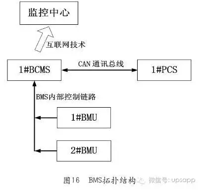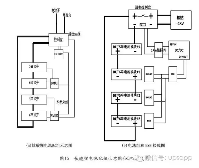 例如,某通信基站使用48V/300Ah鈦酸鋰電池(實物圖見圖14),每組電池由22只300Ah的電池模塊串聯(lián)組成,其中300Ah的電池是由10個單電芯容量為30Ah的電芯并聯(lián)組成,22節(jié)300Ah的電池模塊分別有2個6串和2個5串模組串聯(lián)組成一個48V/300AH的電池組,整組電池由BMS系統(tǒng)控制,由一個BCMS(BatteryClusterManagementSystem,主控電池管理系統(tǒng))負責管理一個電池組中的全部BMU(BatteryManagementUnit,電池組管理單元),同時具備電池組的電流采集,總電壓采集,漏電檢測功能,并在電池組狀態(tài)發(fā)生異常時驅(qū)動斷開高壓功率接觸器,使電池組退出運行,保障電池使用安全。兩個BMU,每個BMU負責管理12串單體電池模塊。具有電池電壓采集,多點溫度采集,各種保護和電池組均衡控制等功能。鈦酸鋰電池配組示意圖和BMS接線如圖15所示。