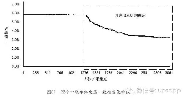 從圖21可以看出300Ah電池組22模組在開啟BMU均衡的時候,電壓一致性從分散的狀態(tài)逐漸趨于集中,表明單體均衡功能有效。