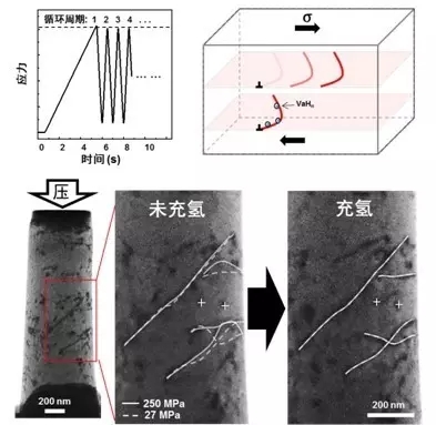 圖:循環(huán)應力作用下,金屬鋁中的位錯在充氫之后運動停止