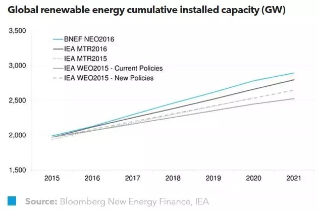 中國儲能網訊:10月24日,國際能源署(IEA)發(fā)布了最新的可再生能源市場中期報告(Medium-TermRenewable Energy Market Report,下簡稱MTR2016),這份報告與彭博新能源財經的2016年新能源展望(NEO2016)有何異同?