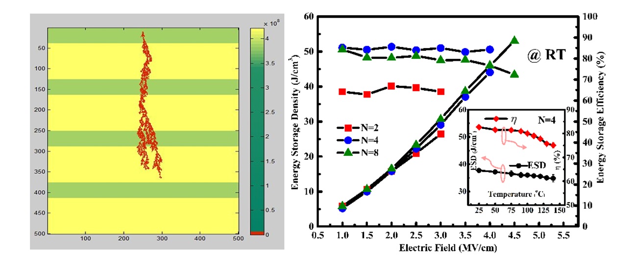 近日,西安交通大學(xué)賈春林科學(xué)家工作室劉明副教授指導(dǎo)的博士生孫梓雄利用射頻磁控濺射技術(shù)制備出高質(zhì)量的Ba0.7Ca0.3TiO3/BaZr0.2Ti0.8O3(BCT/BZT) 多層復(fù)合薄膜并研究了其儲能性能。研究表明在多層膜總厚度一致的情況下,通過增加周期數(shù)(BCT相與BZT相之間的界面數(shù))可以有效地提高該薄膜材料的儲能密度。同時,通過計算機仿真模擬揭示界面數(shù)的增加可以有效地阻礙電流樹枝的發(fā)展,從而通過提高樣品擊穿場強來達(dá)到材料儲能密度的提高。此類多層薄膜材料不僅表現(xiàn)出優(yōu)異的室溫儲能特性,同時在140oC下依然保持較高的儲能密度和儲能效率。這將有可能實現(xiàn)混合動力汽車前級水冷系統(tǒng)的摘除,大大降低生產(chǎn)成本和提高機電系統(tǒng)的微型化。同時,該項研究結(jié)果將對尋求更高儲能密度提供重要的實驗途徑和理論依據(jù)。