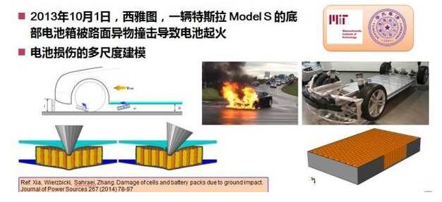 這是我們幾年前做的研究(圖2),是在整車層面上,當時夏勇老師在MIT訪問一年,2013年10月1號著名的特斯拉Model S事故,把底板打穿了,一組電池著火了,夏勇老師做了從汽車底部沖擊電池的建模和仿真,這是兩年前發(fā)表的,當時的模型還不是很準確,現(xiàn)在我們從材料層面做得很細,相信再過幾年一定會有一個很好的能夠預測的模型。