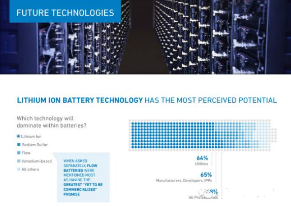 大部分能源專業(yè)認為分布式發(fā)電和可再生能源將成為未來電力行業(yè)的未來,在5-7年內(nèi)電池和電容儲能將是應用最廣泛的儲能技術,60%的專業(yè)人士認為鋰電池將是主導的技術,但是從商業(yè)潛力上來看液流電池將具有相當?shù)陌l(fā)展空間。
